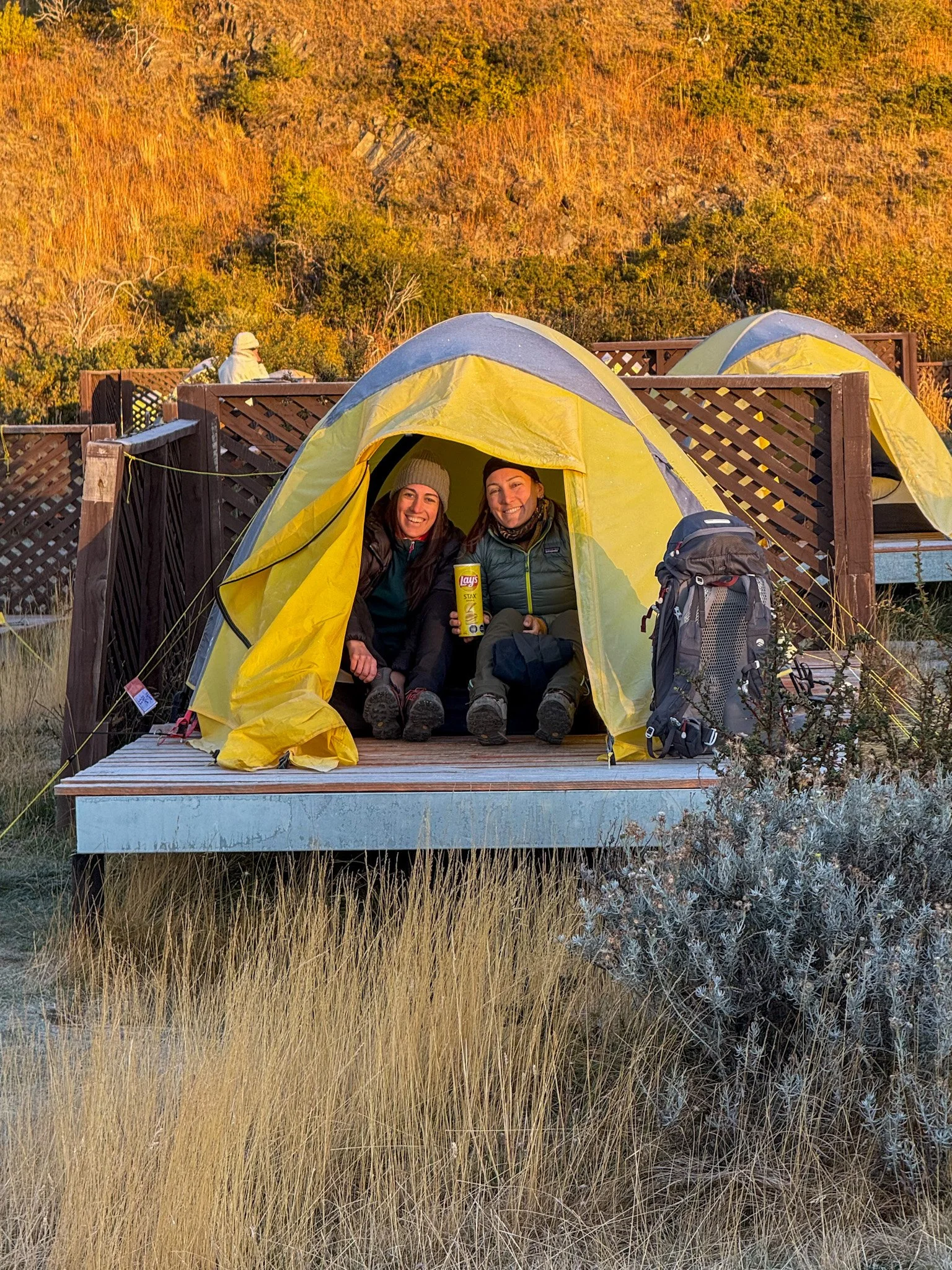 Incluye: todo el equipamento, lugar en el camping, carpa, bolsa de dormir, aislante, desayuno, box de almuerzo y cena.